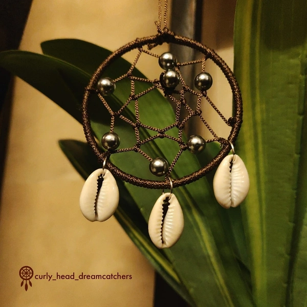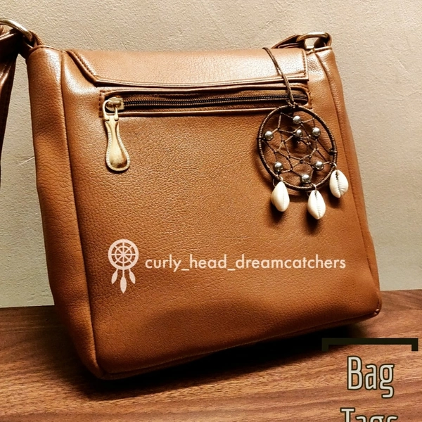 Dreamcatcher Ring embedded in Brown Color with Silver beads on the web and little shells hanging below it. Make your Handbags, Slingbags more stylish with Dreamcatcher Bag charms. Delivery within 5 to 7 business days.